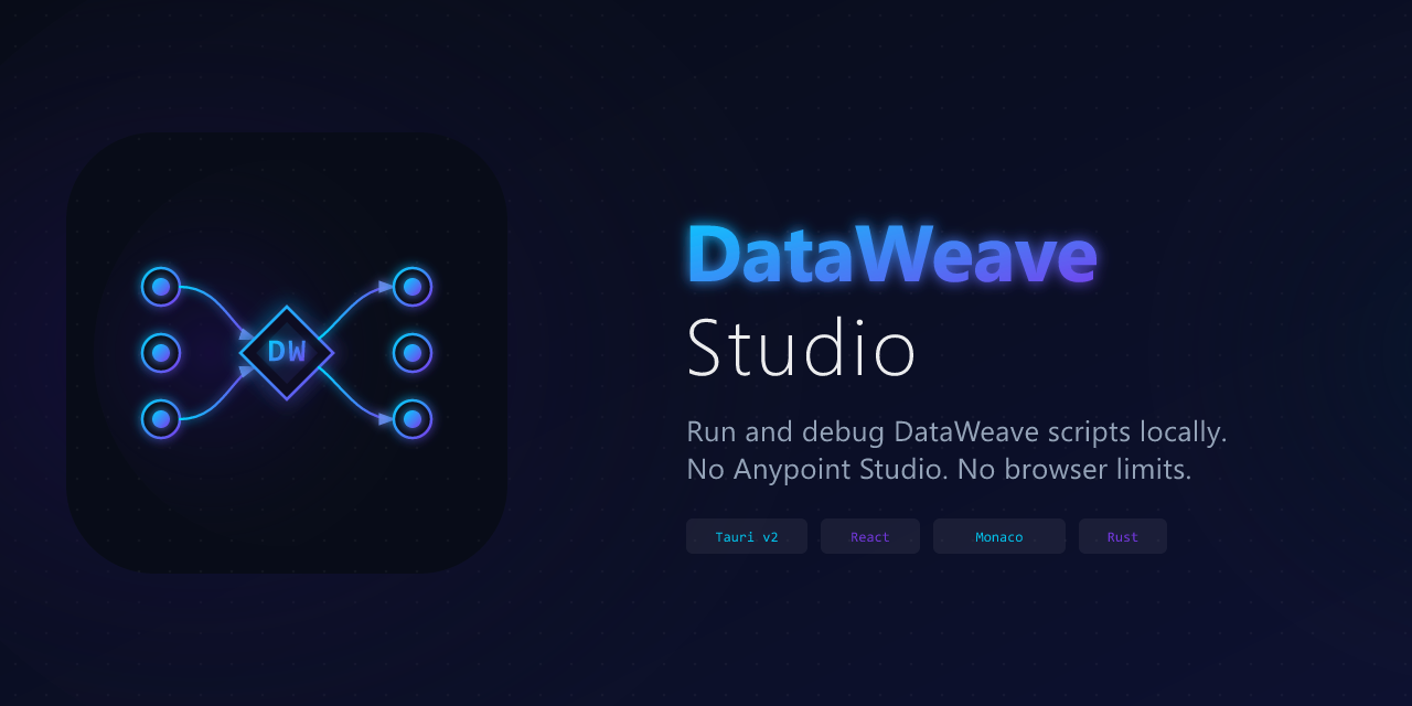 Run and debug DataWeave 2.0 scripts without Anypoint Studio. Full Monaco editor, cURL importer, multipart builder — all offline.